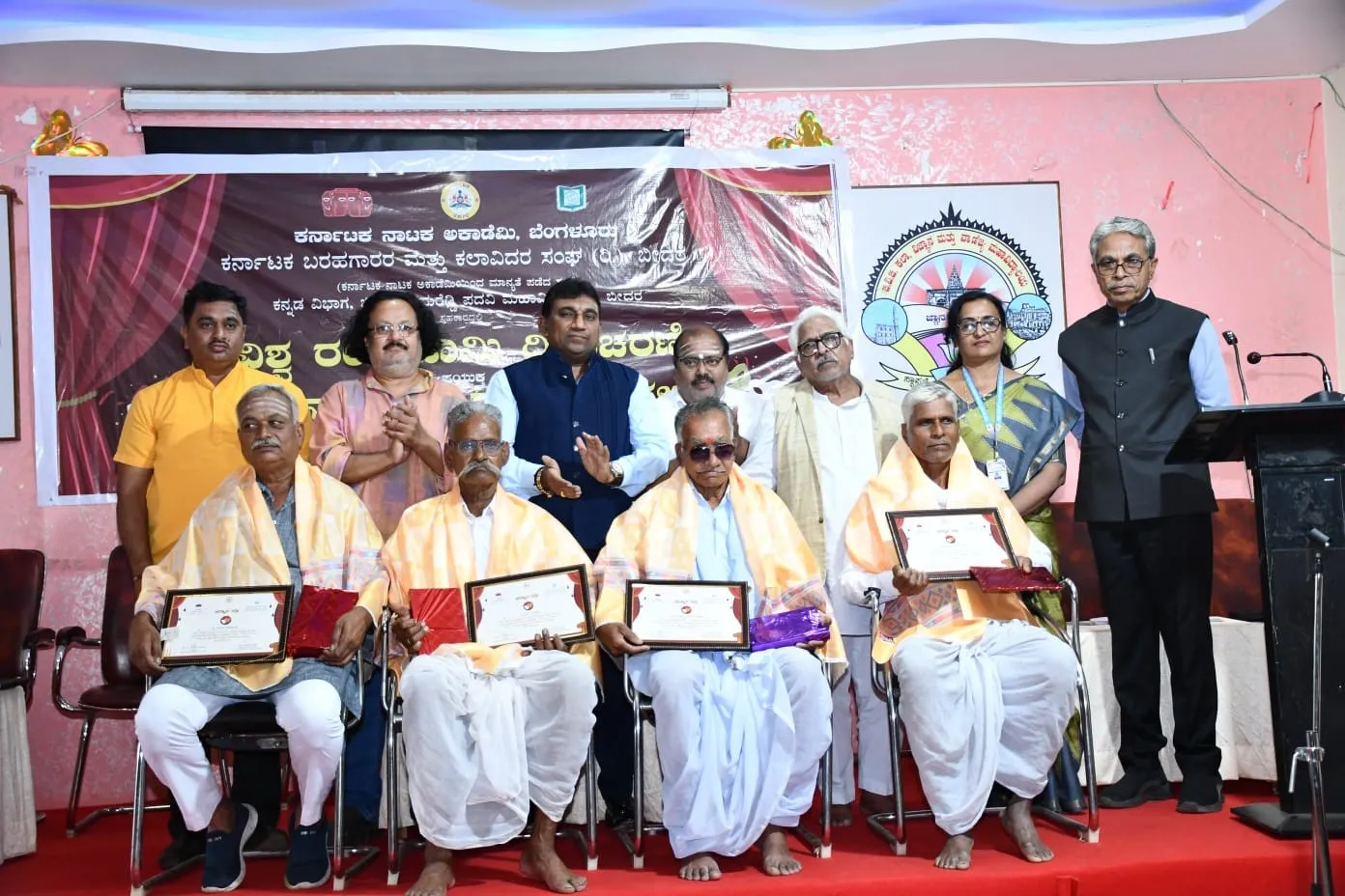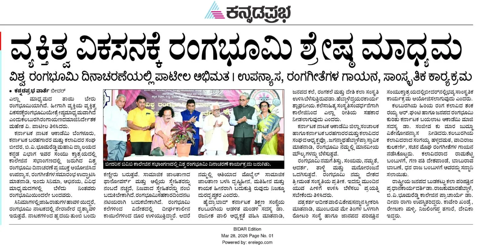 World theatre Day celebrated by departmenet Kannada on 27/3/26 shri Mahesh V Patil, .Dr.Rajnesh Wali Goverrning council member HKE society, Dr.Jaganath Hebbale ,Shri shankrayya Ganti Dr.Deepa Raga Principal were present